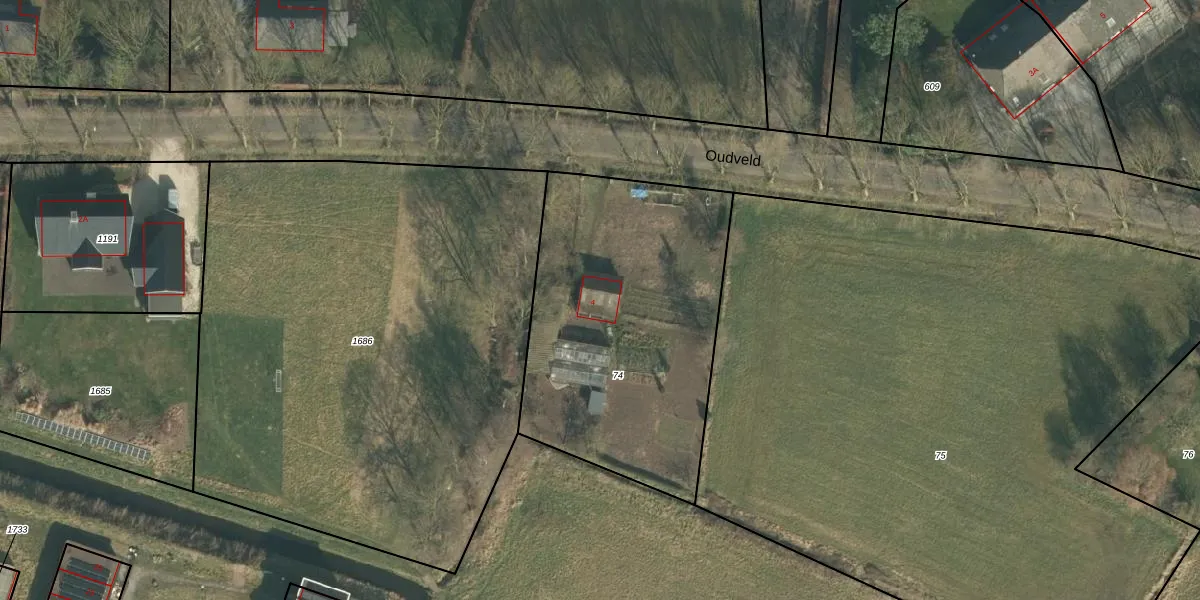 Oudveld 4 is gelegen op kadastraal perceel ERP00R74. Deze kadastrale aanduiding is uniek en wordt gebruikt door het Kadaster om eigendomsrechten en andere zakelijke rechten vast te leggen. Het perceel maakt onderdeel uit van de kadastrale gemeente Erp.