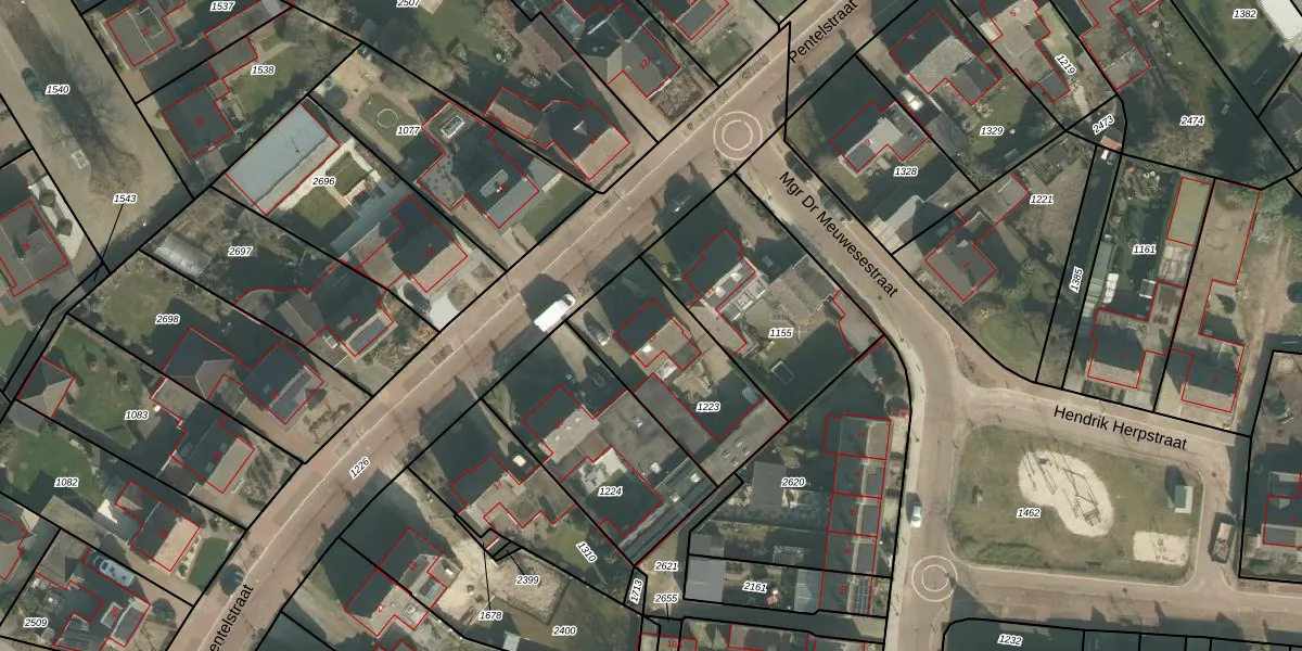 Pentelstraat 13 is gelegen op kadastraal perceel ERP00M1223. Deze kadastrale aanduiding is uniek en wordt gebruikt door het Kadaster om eigendomsrechten en andere zakelijke rechten vast te leggen. Het perceel maakt onderdeel uit van de kadastrale gemeente Erp.