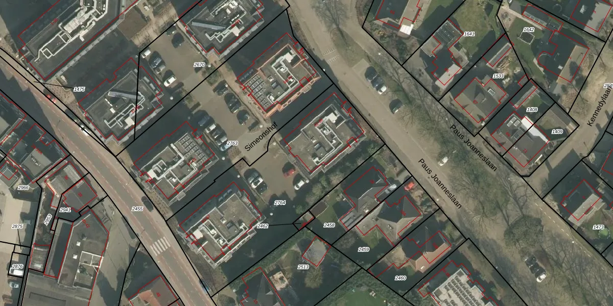 Het perceel waarop Simeonshof 96 staat heeft een oppervlakte van 1995 m². Dit is een zeer groot perceel. De perceeloppervlakte wordt geregistreerd door het Kadaster. Gedetailleerde informatie over de maten van dit perceel kunt u vinden in het rapport Kadastrale kaart met maatvoering van Simeonshof 96.