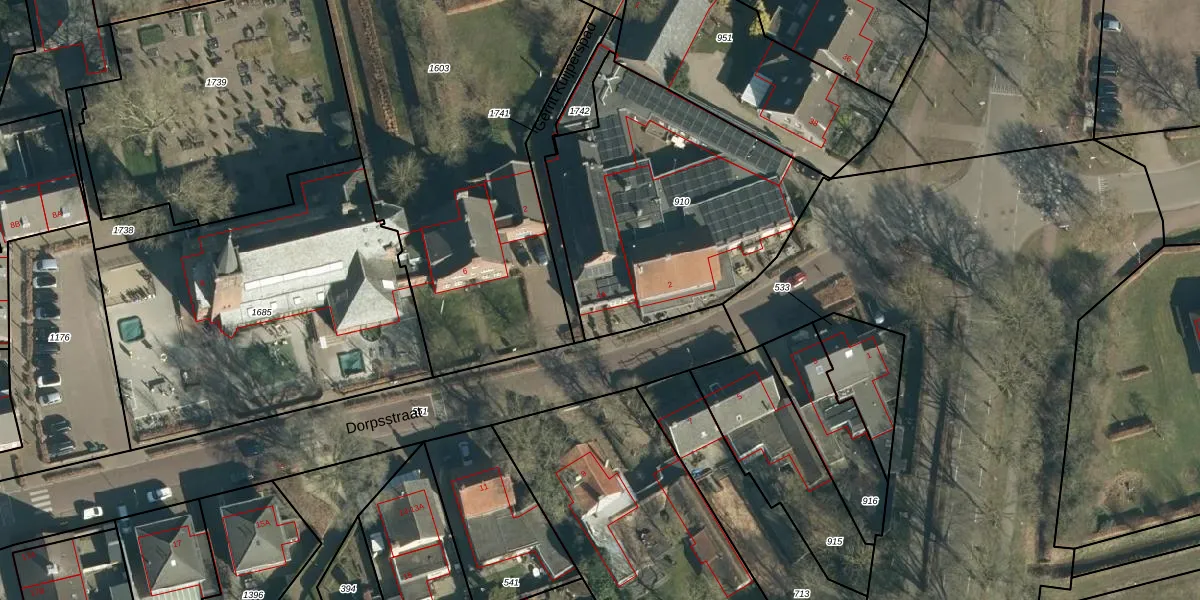 Het perceel waarop Dorpsstraat 4-A staat heeft een oppervlakte van 1282 m². Dit is een zeer groot perceel. De perceeloppervlakte wordt geregistreerd door het Kadaster. Gedetailleerde informatie over de maten van dit perceel kunt u vinden in het rapport Kadastrale kaart met maatvoering van Dorpsstraat 4-A.