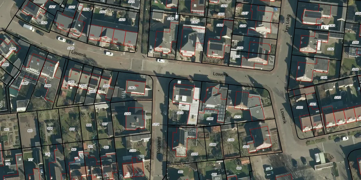 Het perceel waarop Lowerik 19 staat heeft een oppervlakte van 436 m². Dit is een groot perceel. De perceeloppervlakte wordt geregistreerd door het Kadaster. Gedetailleerde informatie over de maten van dit perceel kunt u vinden in het rapport Kadastrale kaart met maatvoering van Lowerik 19.