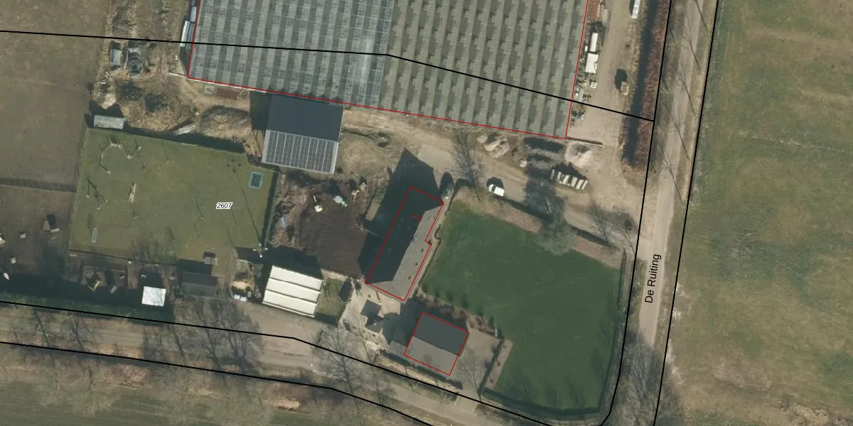 Het perceel waarop De Ruiting 2 staat heeft een oppervlakte van 1,8 ha. Dit is een zeer groot perceel. De perceeloppervlakte wordt geregistreerd door het Kadaster. Gedetailleerde informatie over de maten van dit perceel kunt u vinden in het rapport Kadastrale kaart met maatvoering van De Ruiting 2.