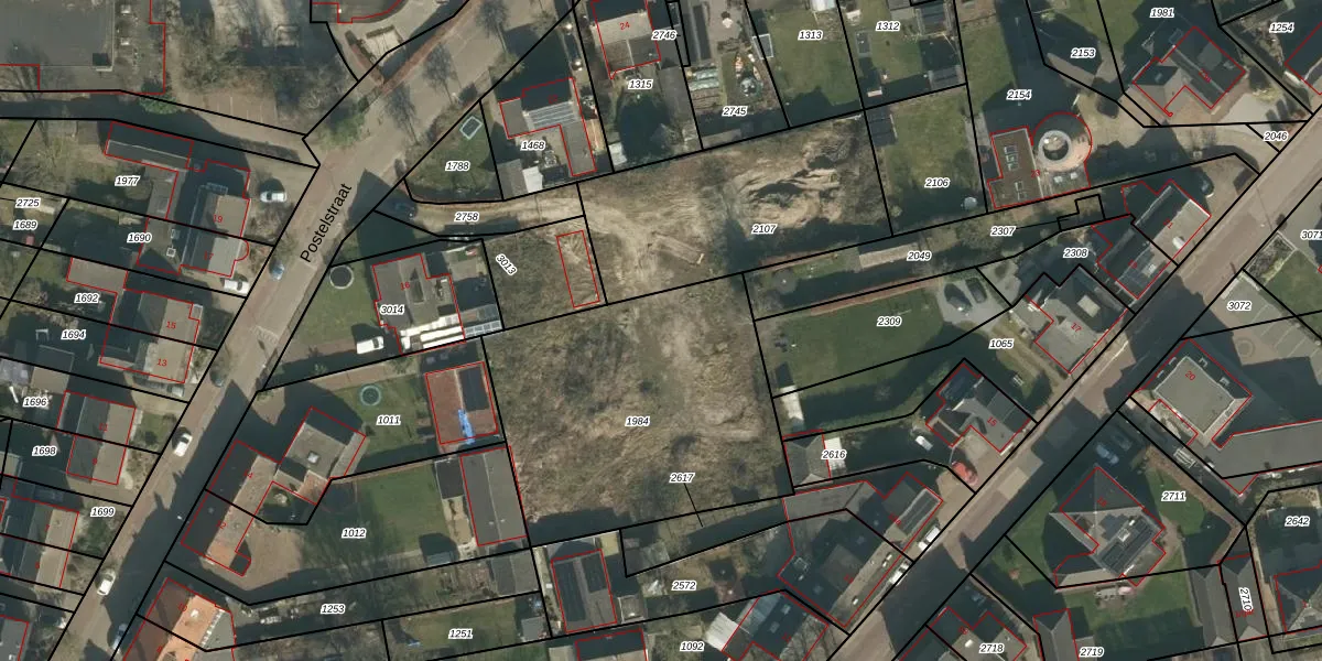 Het perceel waarop Postelstraat 20-b staat heeft een oppervlakte van 1374 m². Dit is een zeer groot perceel. De perceeloppervlakte wordt geregistreerd door het Kadaster. Gedetailleerde informatie over de maten van dit perceel kunt u vinden in het rapport Kadastrale kaart met maatvoering van Postelstraat 20-b.