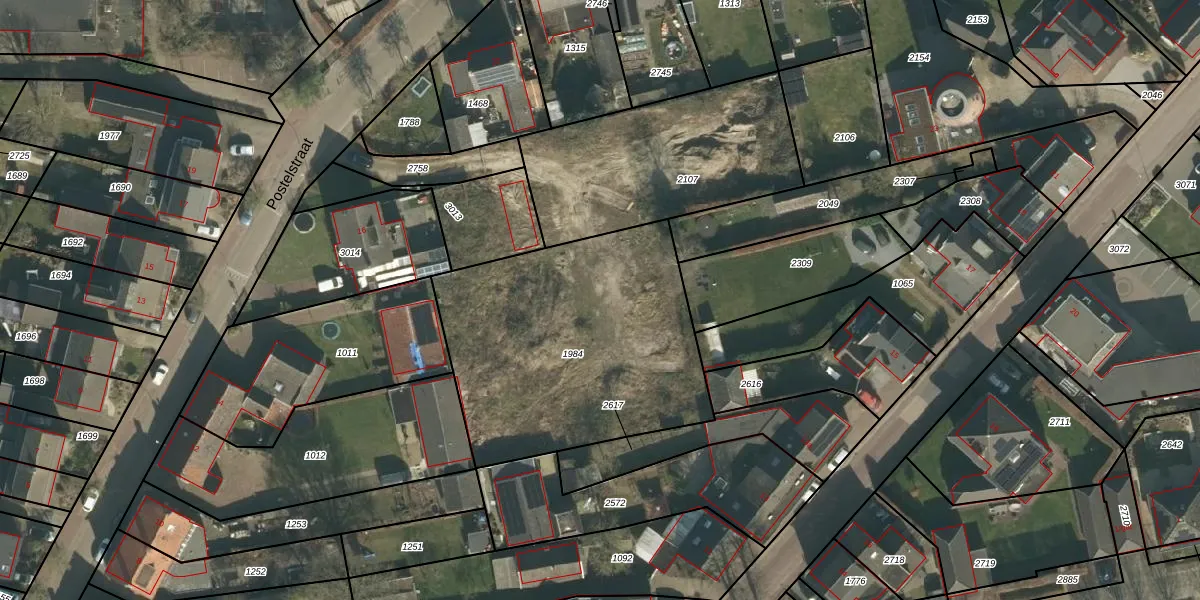 Het perceel waarop Postelstraat 20-c staat heeft een oppervlakte van 1374 m². Dit is een zeer groot perceel. De perceeloppervlakte wordt geregistreerd door het Kadaster. Gedetailleerde informatie over de maten van dit perceel kunt u vinden in het rapport Kadastrale kaart met maatvoering van Postelstraat 20-c.