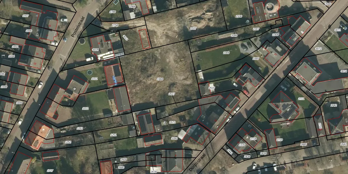 Het perceel waarop Postelstraat 20-f staat heeft een oppervlakte van 1374 m². Dit is een zeer groot perceel. De perceeloppervlakte wordt geregistreerd door het Kadaster. Gedetailleerde informatie over de maten van dit perceel kunt u vinden in het rapport Kadastrale kaart met maatvoering van Postelstraat 20-f.