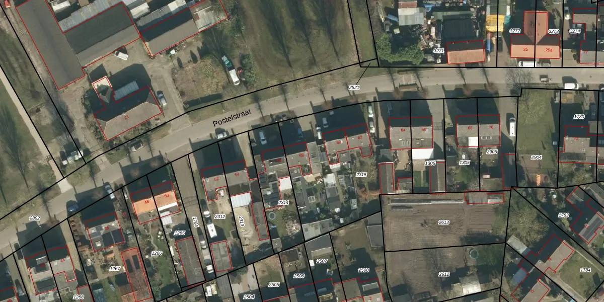 Het perceel waarop Postelstraat 58 staat heeft een oppervlakte van 1492 m². Dit is een zeer groot perceel. De perceeloppervlakte wordt geregistreerd door het Kadaster. Gedetailleerde informatie over de maten van dit perceel kunt u vinden in het rapport Kadastrale kaart met maatvoering van Postelstraat 58.