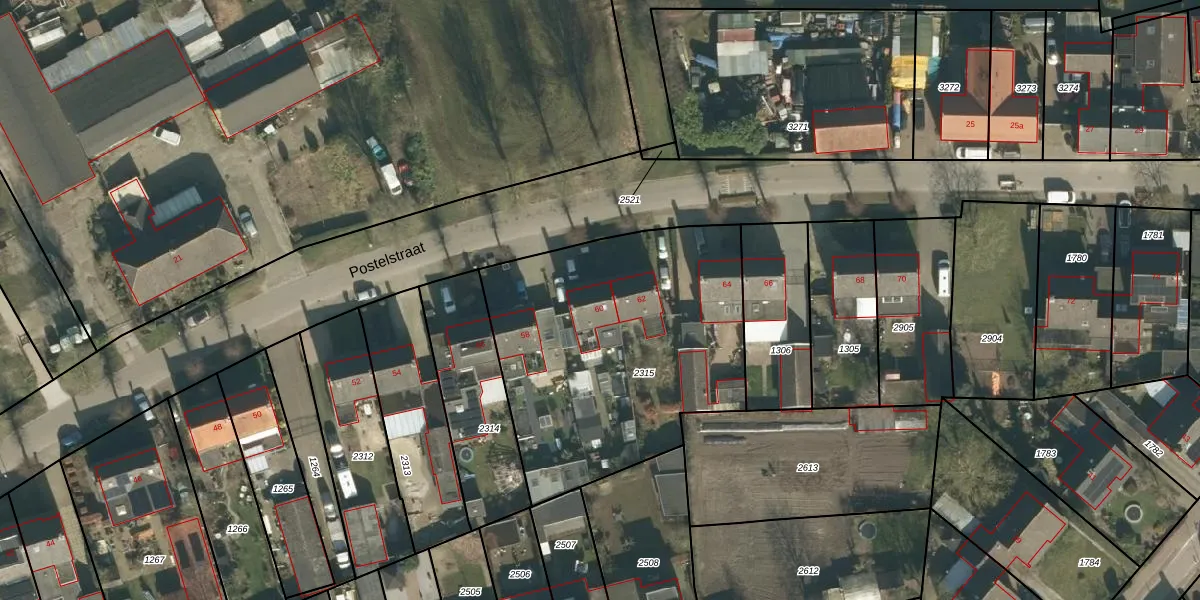 Het perceel waarop Postelstraat 60 staat heeft een oppervlakte van 1492 m². Dit is een zeer groot perceel. De perceeloppervlakte wordt geregistreerd door het Kadaster. Gedetailleerde informatie over de maten van dit perceel kunt u vinden in het rapport Kadastrale kaart met maatvoering van Postelstraat 60.