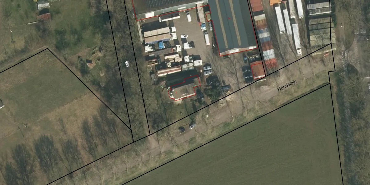 Het perceel waarop Hondsdijk 1 staat heeft een oppervlakte van 5185 m². Dit is een zeer groot perceel. De perceeloppervlakte wordt geregistreerd door het Kadaster. Gedetailleerde informatie over de maten van dit perceel kunt u vinden in het rapport Kadastrale kaart met maatvoering van Hondsdijk 1.