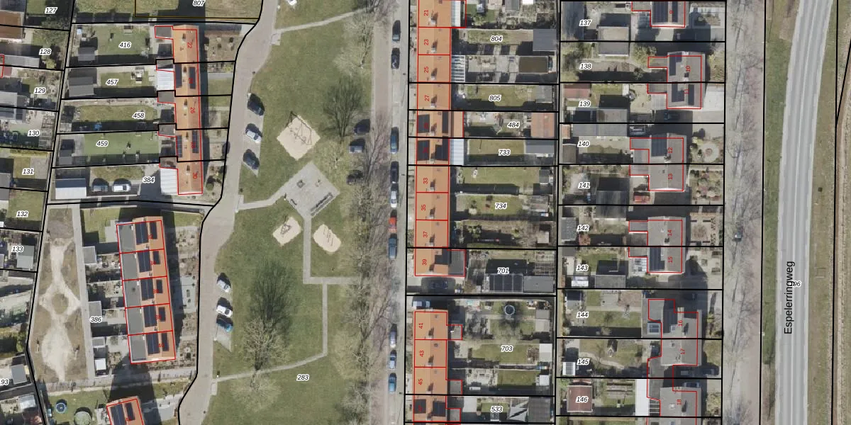 Het adres is gelegen op perceel 734 in de sectie EZ en de kadastrale gemeente Noordoostpolder. De kadastrale aanduiding is aldus NOP00-EZ-734. Het perceel is kleiner dan gemiddeld in Noordoostpolder. Het perceel is 688 m² groot, terwijl het gemiddelde ligt op 2,1 ha. Het grootste perceel in de kadastrale gemeente is 47,42 km². Het kleinste perceel heeft een oppervlakte van 0 m². Op het perceel zijn 3 adressen aanwezig. De laatste wijziging in het de Basisregistratie Kadaster (BRK) was op 04-05-2022.