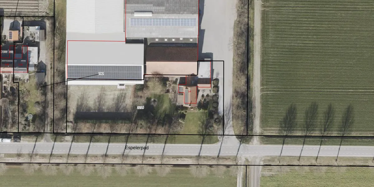 Espelerpad 14 is gelegen op kadastraal perceel NOP00E2214. Deze kadastrale aanduiding is uniek en wordt gebruikt door het Kadaster om eigendomsrechten en andere zakelijke rechten vast te leggen. Het perceel maakt onderdeel uit van de kadastrale gemeente Noordoostpolder.