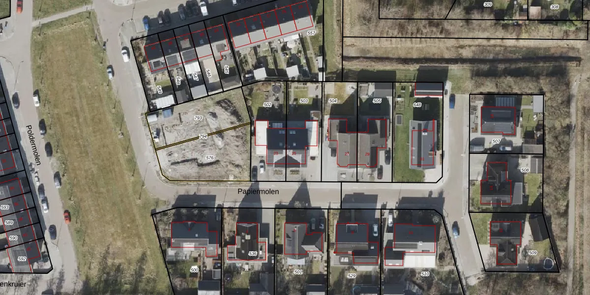 Het perceel waarop Papiermolen 25 staat heeft een oppervlakte van 408 m². Dit is een groot perceel. De perceeloppervlakte wordt geregistreerd door het Kadaster. Gedetailleerde informatie over de maten van dit perceel kunt u vinden in het rapport Kadastrale kaart met maatvoering van Papiermolen 25.