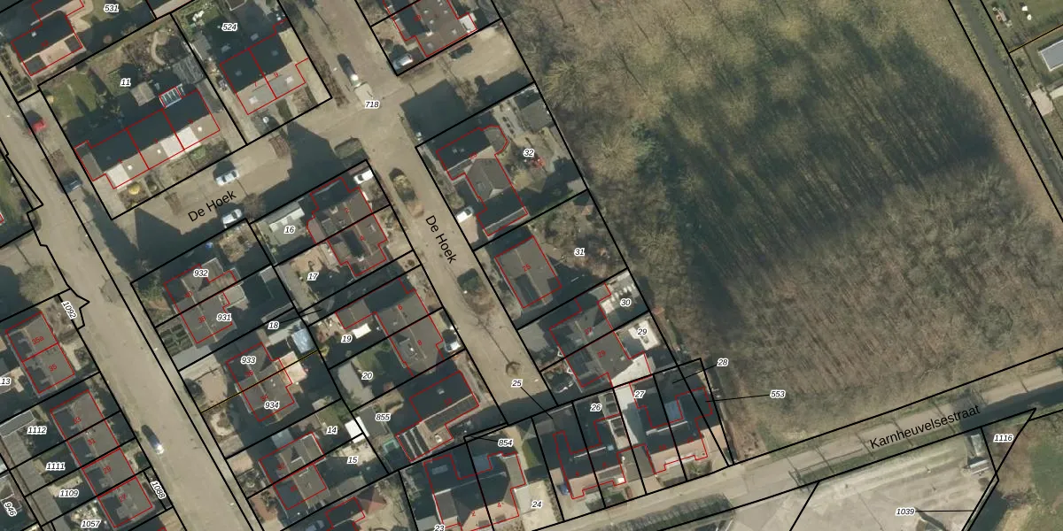 Het perceel waarop De Hoek 25 staat heeft een oppervlakte van 411 m². Dit is een groot perceel. De perceeloppervlakte wordt geregistreerd door het Kadaster. Gedetailleerde informatie over de maten van dit perceel kunt u vinden in het rapport Kadastrale kaart met maatvoering van De Hoek 25.
