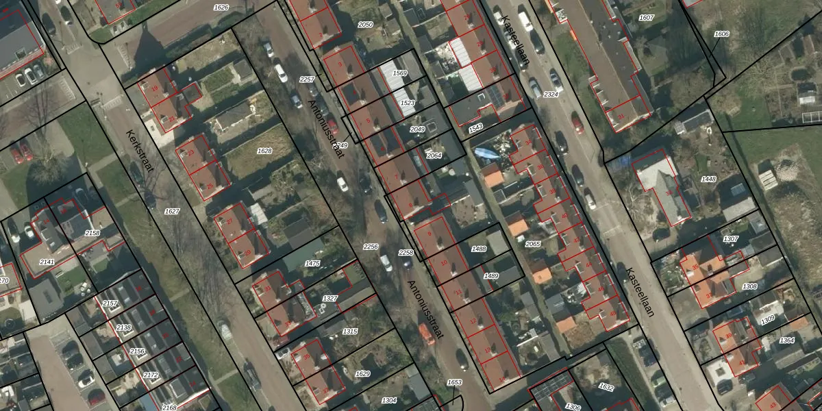 Het perceel waarop Antoniusstraat 8 staat heeft een oppervlakte van 1989 m². Dit is een zeer groot perceel. De perceeloppervlakte wordt geregistreerd door het Kadaster. Gedetailleerde informatie over de maten van dit perceel kunt u vinden in het rapport Kadastrale kaart met maatvoering van Antoniusstraat 8.