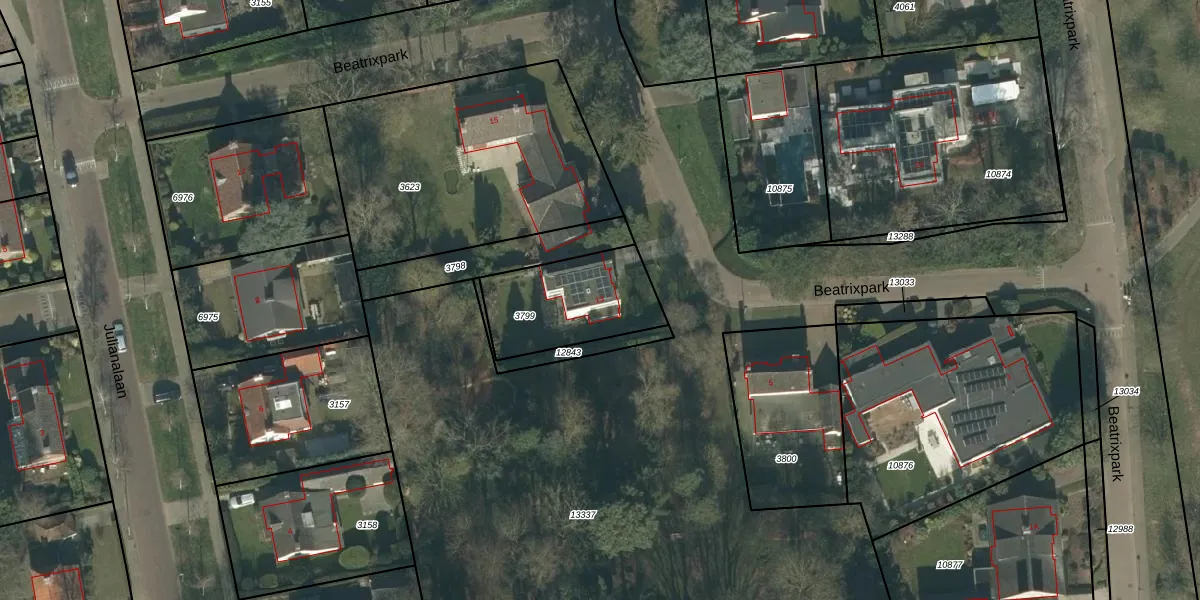 Het perceel waarop Beatrixpark 13 staat heeft een oppervlakte van 395 m². Dit is een groot perceel. De perceeloppervlakte wordt geregistreerd door het Kadaster. Gedetailleerde informatie over de maten van dit perceel kunt u vinden in het rapport Kadastrale kaart met maatvoering van Beatrixpark 13.