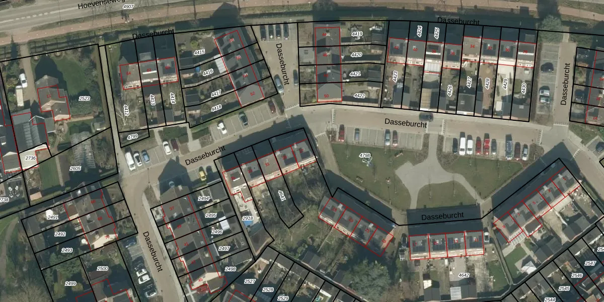 Het perceel waarop Dasseburcht 27 staat heeft een oppervlakte van 3359 m². Dit is een zeer groot perceel. De perceeloppervlakte wordt geregistreerd door het Kadaster. Gedetailleerde informatie over de maten van dit perceel kunt u vinden in het rapport Kadastrale kaart met maatvoering van Dasseburcht 27.