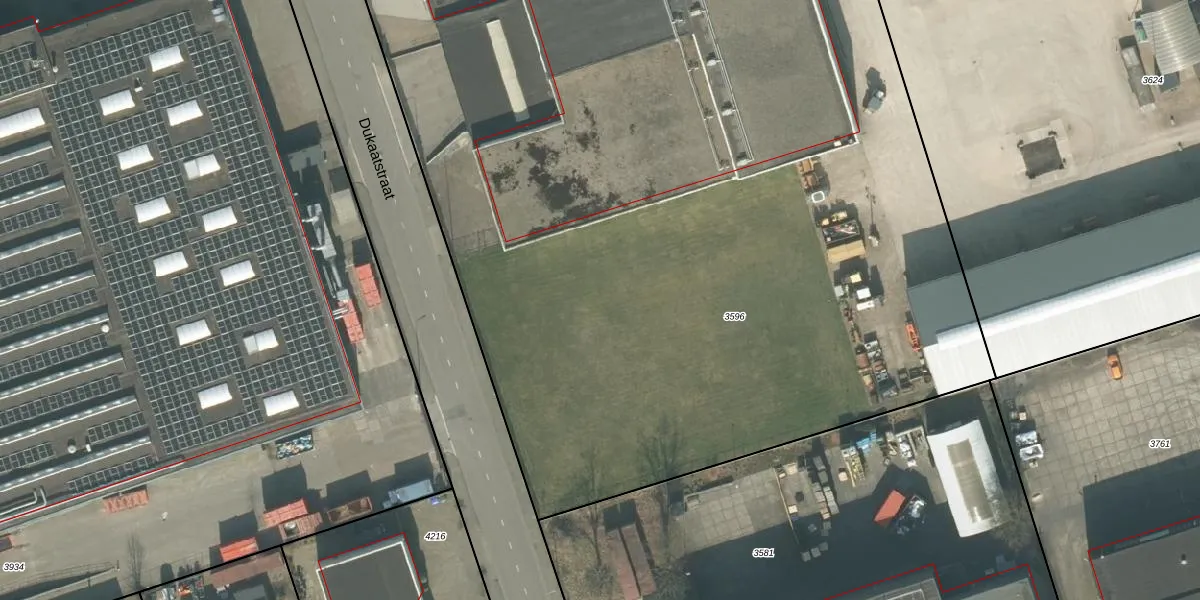 Het perceel waarop Dukaatstraat 33 staat heeft een oppervlakte van 9535 m². Dit is een zeer groot perceel. De perceeloppervlakte wordt geregistreerd door het Kadaster. Gedetailleerde informatie over de maten van dit perceel kunt u vinden in het rapport Kadastrale kaart met maatvoering van Dukaatstraat 33.