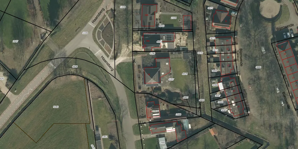 Het perceel waarop Haansberg 28 staat heeft een oppervlakte van 1354 m². Dit is een zeer groot perceel. De perceeloppervlakte wordt geregistreerd door het Kadaster. Gedetailleerde informatie over de maten van dit perceel kunt u vinden in het rapport Kadastrale kaart met maatvoering van Haansberg 28.