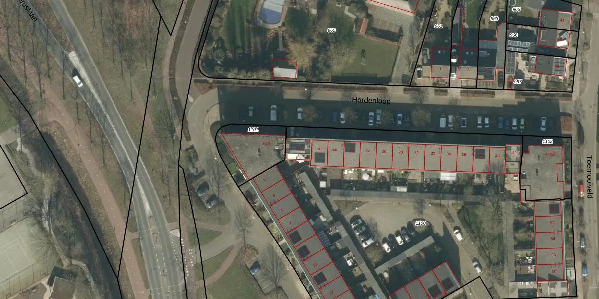 Hordenloop 16 is gelegen op kadastraal perceel ETN01P1100. Deze kadastrale aanduiding is uniek en wordt gebruikt door het Kadaster om eigendomsrechten en andere zakelijke rechten vast te leggen. Het perceel maakt onderdeel uit van de kadastrale gemeente Etten-Leur.