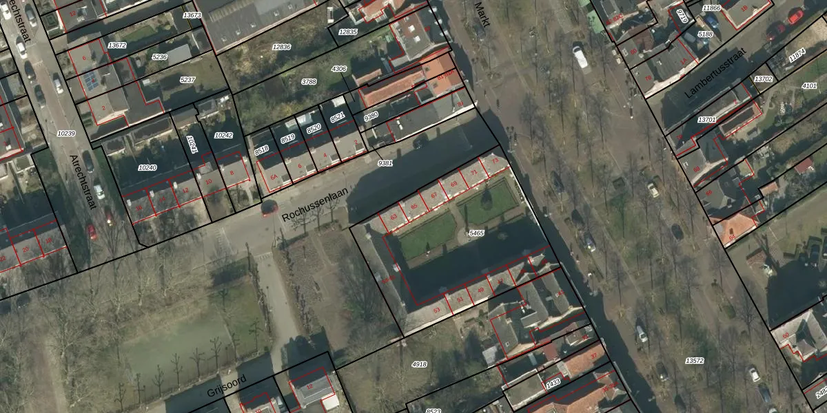 Het perceel waarop Markt 65 staat heeft een oppervlakte van 1315 m². Dit is een zeer groot perceel. De perceeloppervlakte wordt geregistreerd door het Kadaster. Gedetailleerde informatie over de maten van dit perceel kunt u vinden in het rapport Kadastrale kaart met maatvoering van Markt 65.