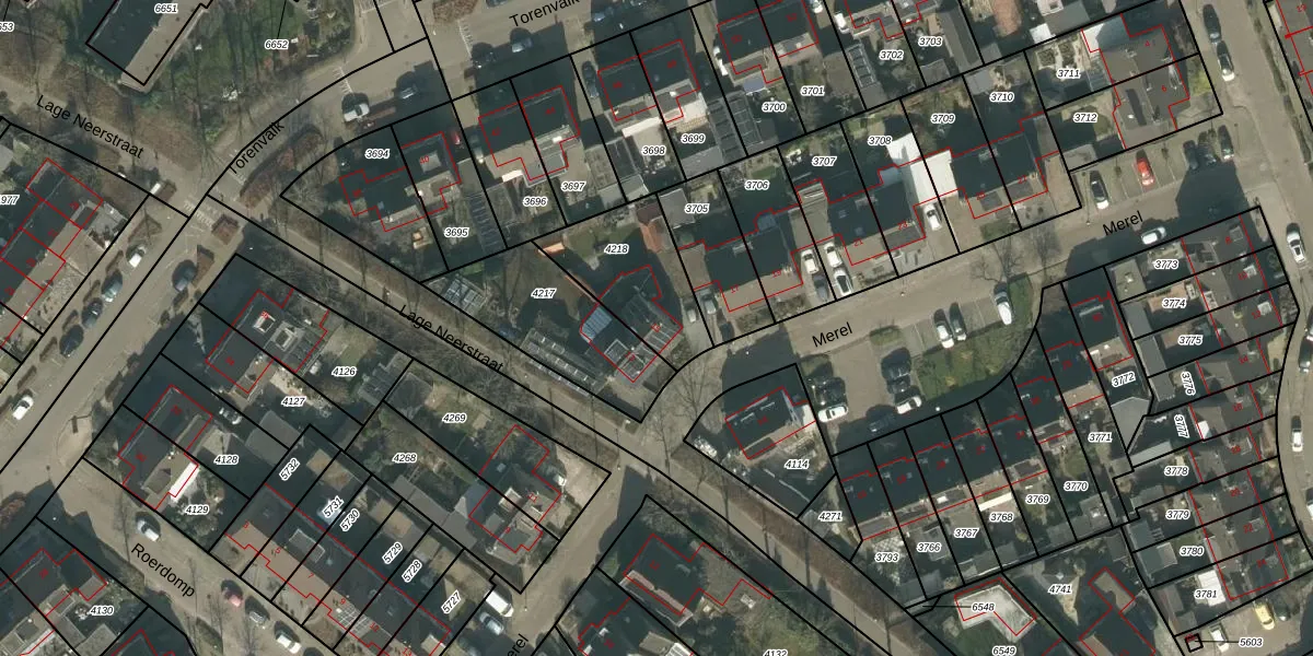 Het perceel waarop Merel 15 staat heeft een oppervlakte van 350 m². Dit is een groot perceel. De perceeloppervlakte wordt geregistreerd door het Kadaster. Gedetailleerde informatie over de maten van dit perceel kunt u vinden in het rapport Kadastrale kaart met maatvoering van Merel 15.