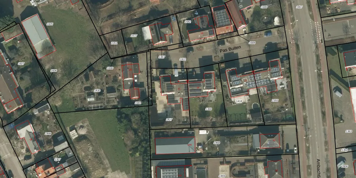 Het perceel waarop Pas Buiten 21 staat heeft een oppervlakte van 728 m². Dit is een groot perceel. De perceeloppervlakte wordt geregistreerd door het Kadaster. Gedetailleerde informatie over de maten van dit perceel kunt u vinden in het rapport Kadastrale kaart met maatvoering van Pas Buiten 21.
