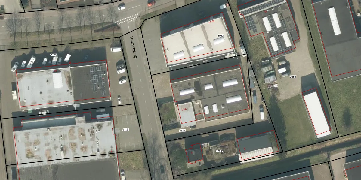 Het perceel waarop Pauvreweg 1-A staat heeft een oppervlakte van 1976 m². Dit is een zeer groot perceel. De perceeloppervlakte wordt geregistreerd door het Kadaster. Gedetailleerde informatie over de maten van dit perceel kunt u vinden in het rapport Kadastrale kaart met maatvoering van Pauvreweg 1-A.