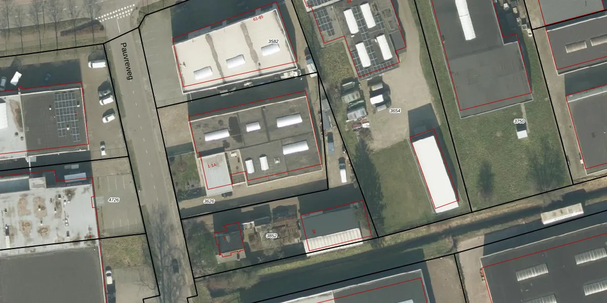 Het perceel waarop Pauvreweg 1-C staat heeft een oppervlakte van 1976 m². Dit is een zeer groot perceel. De perceeloppervlakte wordt geregistreerd door het Kadaster. Gedetailleerde informatie over de maten van dit perceel kunt u vinden in het rapport Kadastrale kaart met maatvoering van Pauvreweg 1-C.