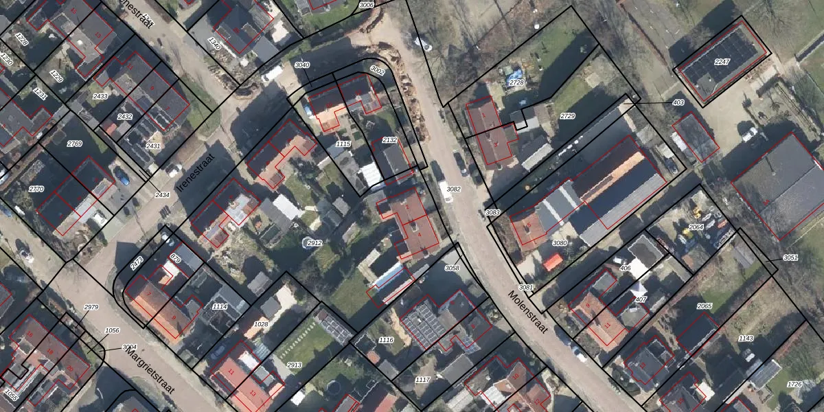 Het perceel waarop Molenstraat 2 staat heeft een oppervlakte van 1929 m². Dit is een zeer groot perceel. De perceeloppervlakte wordt geregistreerd door het Kadaster. Gedetailleerde informatie over de maten van dit perceel kunt u vinden in het rapport Kadastrale kaart met maatvoering van Molenstraat 2.