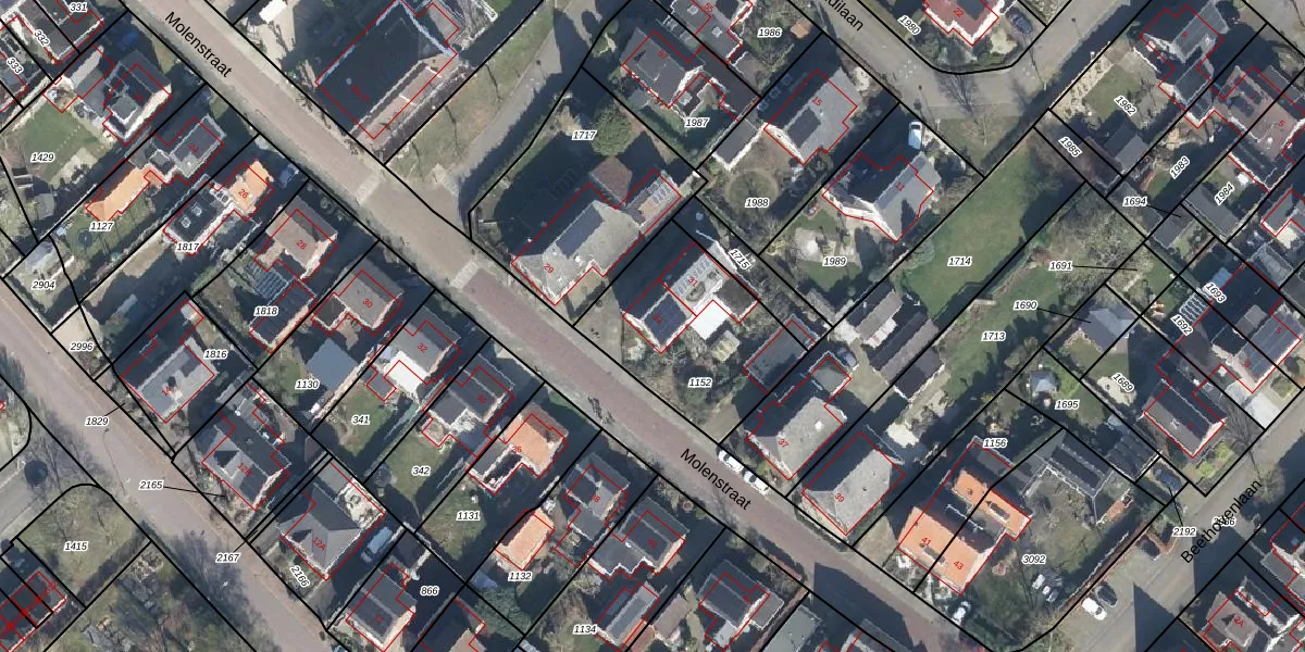 Het perceel waarop Molenstraat 33 staat heeft een oppervlakte van 630 m². Dit is een groot perceel. De perceeloppervlakte wordt geregistreerd door het Kadaster. Gedetailleerde informatie over de maten van dit perceel kunt u vinden in het rapport Kadastrale kaart met maatvoering van Molenstraat 33.