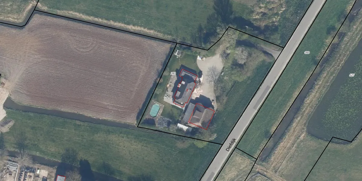 Het perceel waarop Diefdijk 14 staat heeft een oppervlakte van 2985 m². Dit is een zeer groot perceel. De perceeloppervlakte wordt geregistreerd door het Kadaster. Gedetailleerde informatie over de maten van dit perceel kunt u vinden in het rapport Kadastrale kaart met maatvoering van Diefdijk 14.