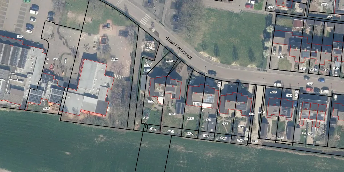 Graaf Florisstraat 10 is gelegen op kadastraal perceel EVD00A1492. Deze kadastrale aanduiding is uniek en wordt gebruikt door het Kadaster om eigendomsrechten en andere zakelijke rechten vast te leggen. Het perceel maakt onderdeel uit van de kadastrale gemeente Everdingen.