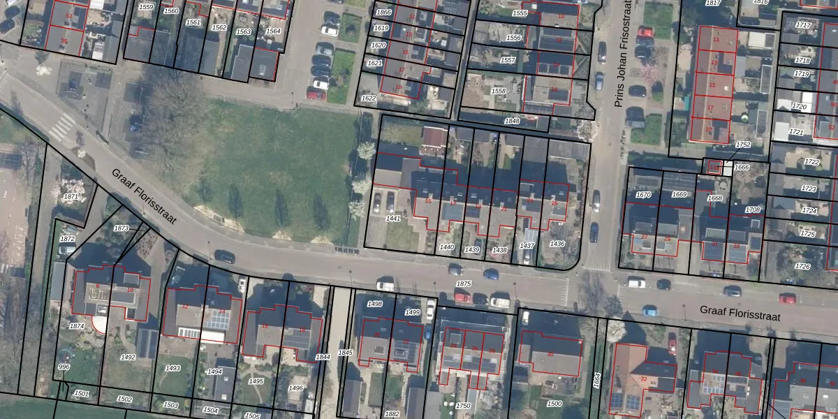Het perceel waarop Graaf Florisstraat 15 staat heeft een oppervlakte van 518 m². Dit is een groot perceel. De perceeloppervlakte wordt geregistreerd door het Kadaster. Gedetailleerde informatie over de maten van dit perceel kunt u vinden in het rapport Kadastrale kaart met maatvoering van Graaf Florisstraat 15.