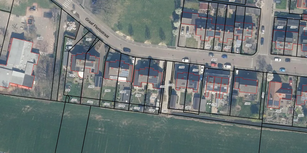 Graaf Florisstraat 18 is gelegen op kadastraal perceel EVD00A1496. Deze kadastrale aanduiding is uniek en wordt gebruikt door het Kadaster om eigendomsrechten en andere zakelijke rechten vast te leggen. Het perceel maakt onderdeel uit van de kadastrale gemeente Everdingen.
