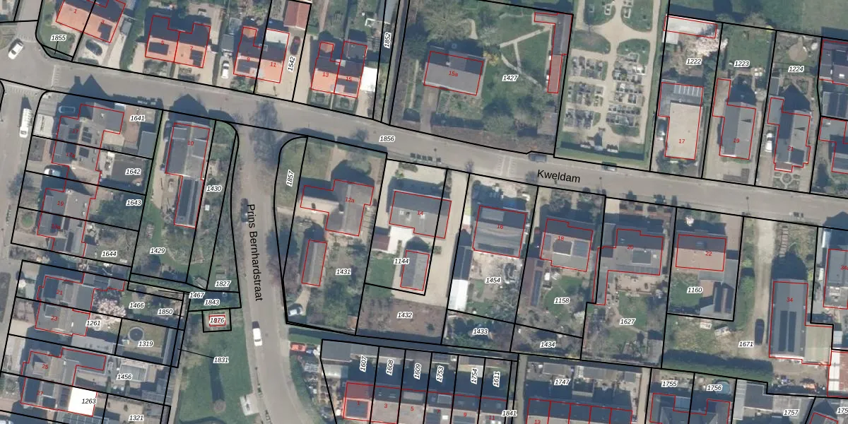 Het perceel waarop Kweldam 14 staat heeft een oppervlakte van 430 m². Dit is een groot perceel. De perceeloppervlakte wordt geregistreerd door het Kadaster. Gedetailleerde informatie over de maten van dit perceel kunt u vinden in het rapport Kadastrale kaart met maatvoering van Kweldam 14.