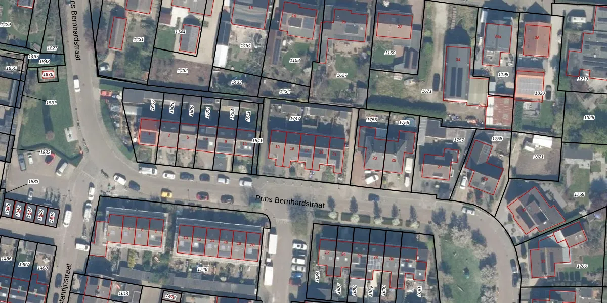 Het perceel waarop Prins Bernhardstraat 17 staat heeft een oppervlakte van 815 m². Dit is een groot perceel. De perceeloppervlakte wordt geregistreerd door het Kadaster. Gedetailleerde informatie over de maten van dit perceel kunt u vinden in het rapport Kadastrale kaart met maatvoering van Prins Bernhardstraat 17.