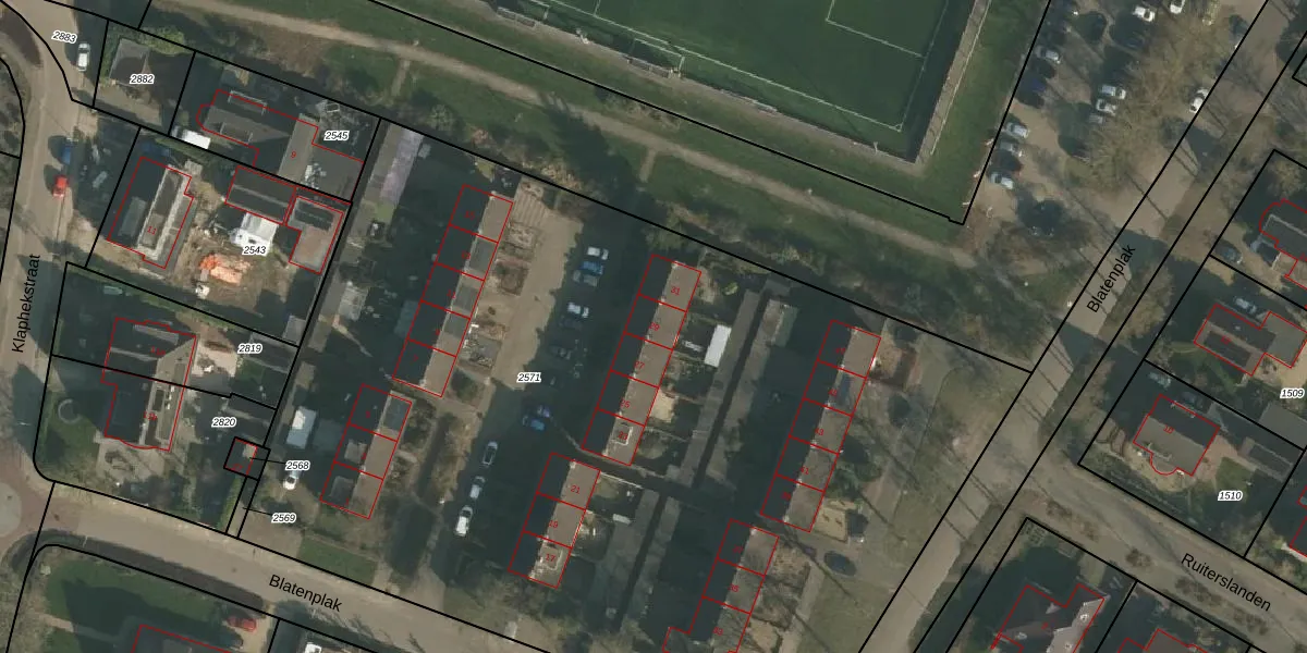 Blatenplak 29 is gelegen op kadastraal perceel EWK00A2571. Deze kadastrale aanduiding is uniek en wordt gebruikt door het Kadaster om eigendomsrechten en andere zakelijke rechten vast te leggen. Het perceel maakt onderdeel uit van de kadastrale gemeente Ewijk.