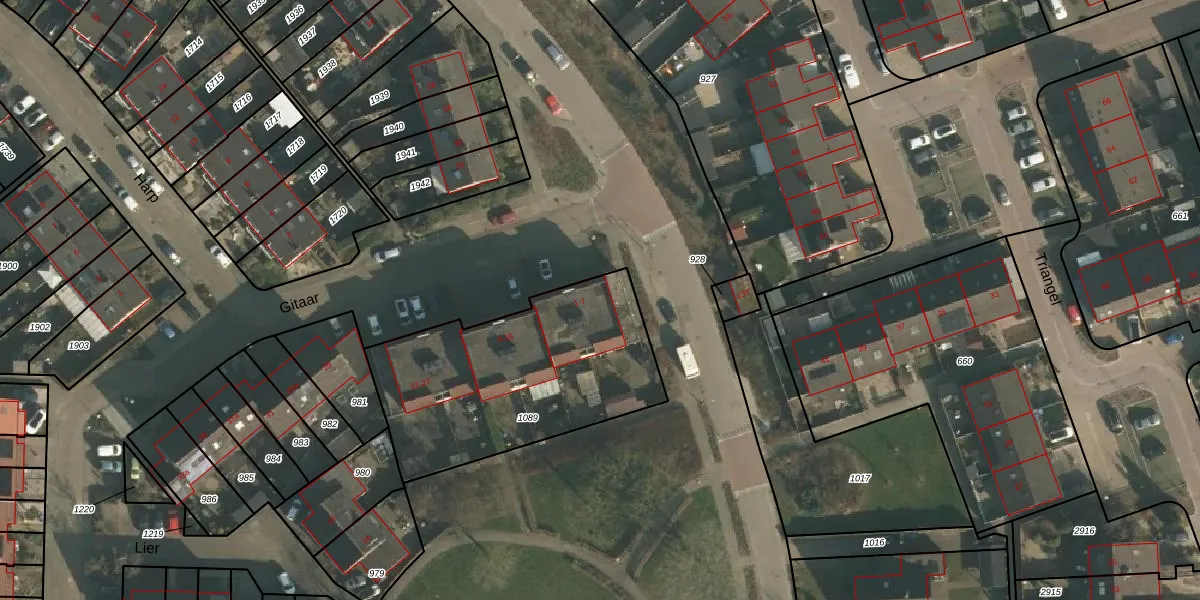 Het perceel waarop Gitaar 1 staat heeft een oppervlakte van 1054 m². Dit is een zeer groot perceel. De perceeloppervlakte wordt geregistreerd door het Kadaster. Gedetailleerde informatie over de maten van dit perceel kunt u vinden in het rapport Kadastrale kaart met maatvoering van Gitaar 1.