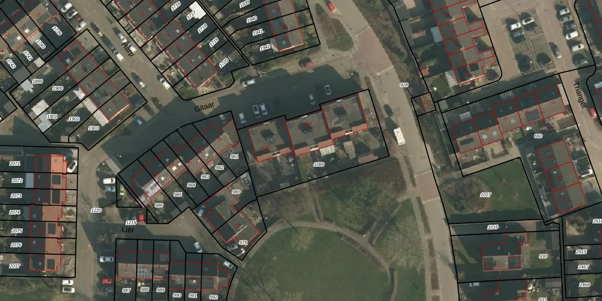 Het perceel waarop Gitaar 19 staat heeft een oppervlakte van 1054 m². Dit is een zeer groot perceel. De perceeloppervlakte wordt geregistreerd door het Kadaster. Gedetailleerde informatie over de maten van dit perceel kunt u vinden in het rapport Kadastrale kaart met maatvoering van Gitaar 19.