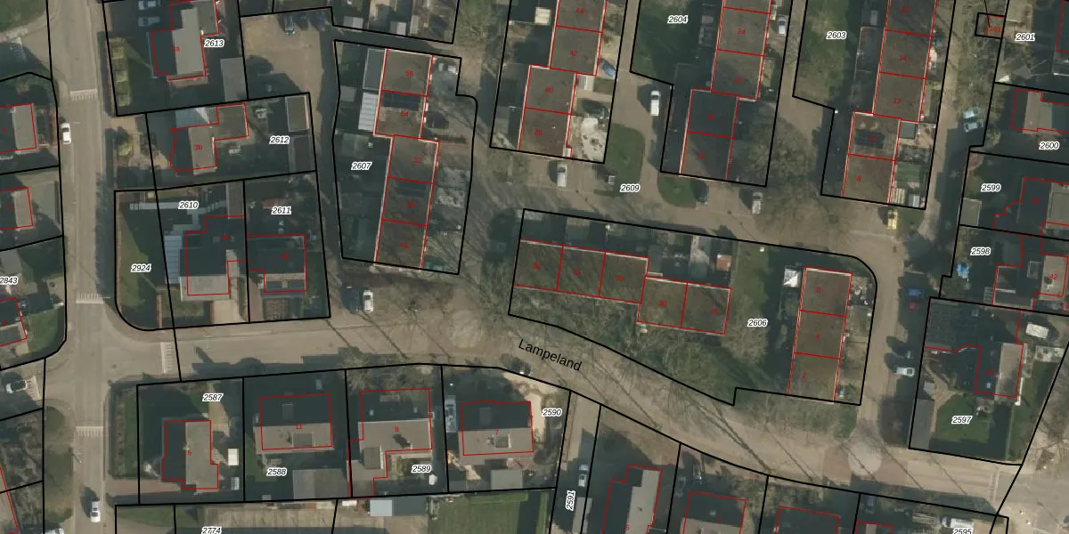 Lampeland 36 is gelegen op kadastraal perceel EWK00A2606. Deze kadastrale aanduiding is uniek en wordt gebruikt door het Kadaster om eigendomsrechten en andere zakelijke rechten vast te leggen. Het perceel maakt onderdeel uit van de kadastrale gemeente Ewijk.
