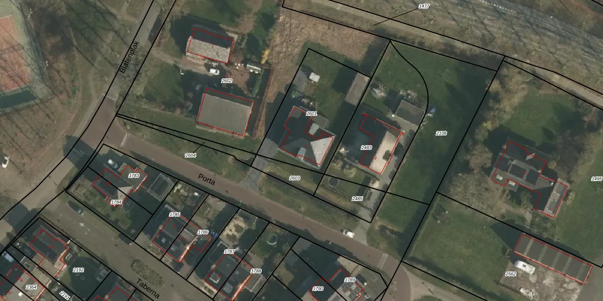 Het perceel waarop Porta 1 staat heeft een oppervlakte van 856 m². Dit is een groot perceel. De perceeloppervlakte wordt geregistreerd door het Kadaster. Gedetailleerde informatie over de maten van dit perceel kunt u vinden in het rapport Kadastrale kaart met maatvoering van Porta 1.