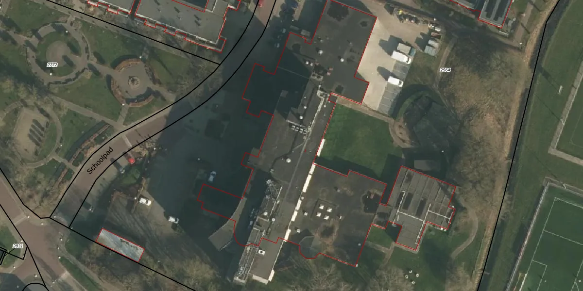 Het perceel waarop Schoolpad 1 staat heeft een oppervlakte van 1,8 ha. Dit is een zeer groot perceel. De perceeloppervlakte wordt geregistreerd door het Kadaster. Gedetailleerde informatie over de maten van dit perceel kunt u vinden in het rapport Kadastrale kaart met maatvoering van Schoolpad 1.