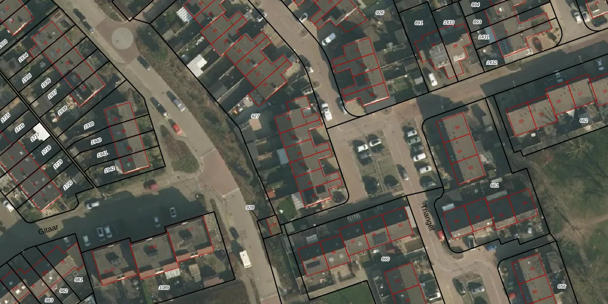 Het perceel waarop Triangel 49 staat heeft een oppervlakte van 2376 m². Dit is een zeer groot perceel. De perceeloppervlakte wordt geregistreerd door het Kadaster. Gedetailleerde informatie over de maten van dit perceel kunt u vinden in het rapport Kadastrale kaart met maatvoering van Triangel 49.