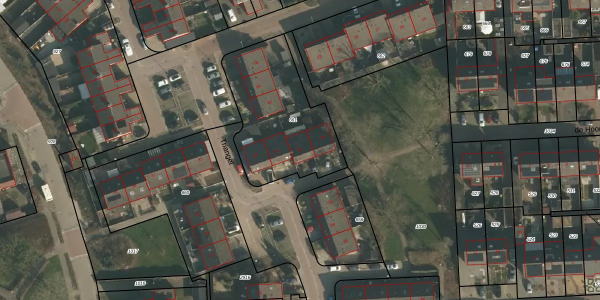 Het perceel waarop Triangel 56 staat heeft een oppervlakte van 1271 m². Dit is een zeer groot perceel. De perceeloppervlakte wordt geregistreerd door het Kadaster. Gedetailleerde informatie over de maten van dit perceel kunt u vinden in het rapport Kadastrale kaart met maatvoering van Triangel 56.