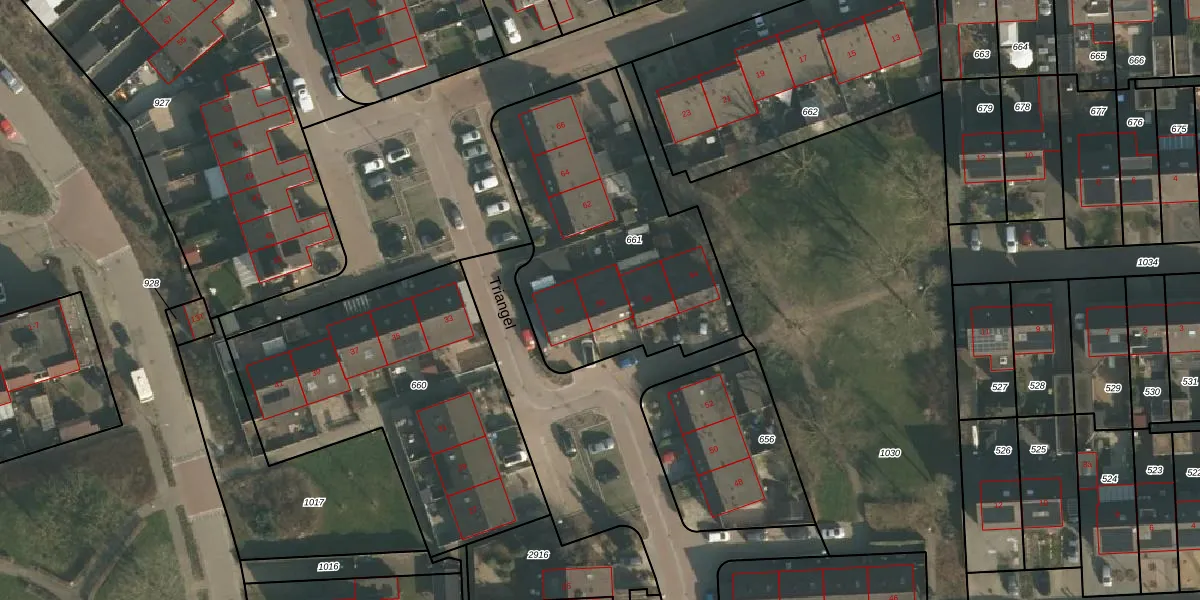 Het perceel waarop Triangel 58 staat heeft een oppervlakte van 1271 m². Dit is een zeer groot perceel. De perceeloppervlakte wordt geregistreerd door het Kadaster. Gedetailleerde informatie over de maten van dit perceel kunt u vinden in het rapport Kadastrale kaart met maatvoering van Triangel 58.