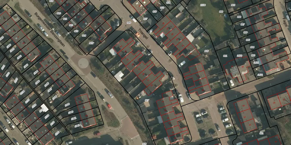 Het perceel waarop Triangel 59 staat heeft een oppervlakte van 2376 m². Dit is een zeer groot perceel. De perceeloppervlakte wordt geregistreerd door het Kadaster. Gedetailleerde informatie over de maten van dit perceel kunt u vinden in het rapport Kadastrale kaart met maatvoering van Triangel 59.