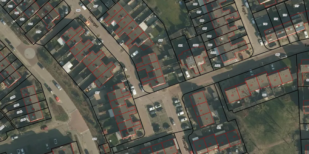 Het perceel waarop Triangel 70 staat heeft een oppervlakte van 1844 m². Dit is een zeer groot perceel. De perceeloppervlakte wordt geregistreerd door het Kadaster. Gedetailleerde informatie over de maten van dit perceel kunt u vinden in het rapport Kadastrale kaart met maatvoering van Triangel 70.