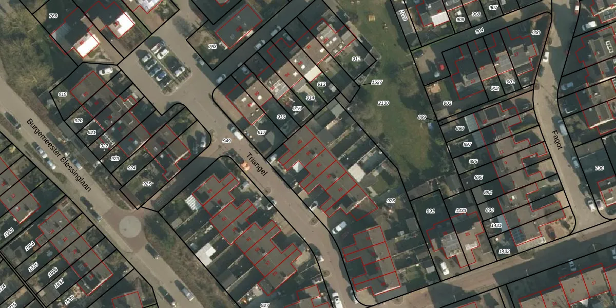 Het perceel waarop Triangel 84 staat heeft een oppervlakte van 1844 m². Dit is een zeer groot perceel. De perceeloppervlakte wordt geregistreerd door het Kadaster. Gedetailleerde informatie over de maten van dit perceel kunt u vinden in het rapport Kadastrale kaart met maatvoering van Triangel 84.