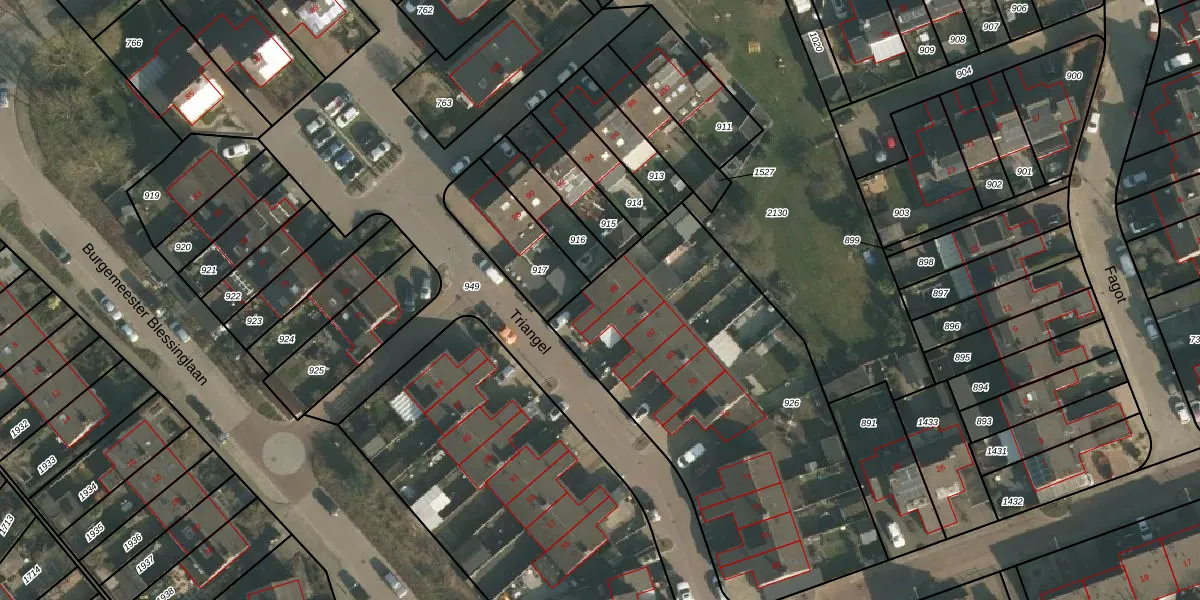 Het perceel waarop Triangel 86 staat heeft een oppervlakte van 1844 m². Dit is een zeer groot perceel. De perceeloppervlakte wordt geregistreerd door het Kadaster. Gedetailleerde informatie over de maten van dit perceel kunt u vinden in het rapport Kadastrale kaart met maatvoering van Triangel 86.