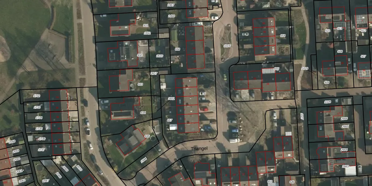 Het perceel waarop Triangel 9 staat heeft een oppervlakte van 1083 m². Dit is een zeer groot perceel. De perceeloppervlakte wordt geregistreerd door het Kadaster. Gedetailleerde informatie over de maten van dit perceel kunt u vinden in het rapport Kadastrale kaart met maatvoering van Triangel 9.