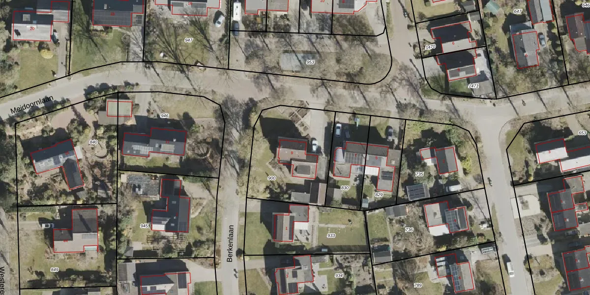 Het perceel waarop Meidoornlaan 9 staat heeft een oppervlakte van 845 m². Dit is een groot perceel. De perceeloppervlakte wordt geregistreerd door het Kadaster. Gedetailleerde informatie over de maten van dit perceel kunt u vinden in het rapport Kadastrale kaart met maatvoering van Meidoornlaan 9.